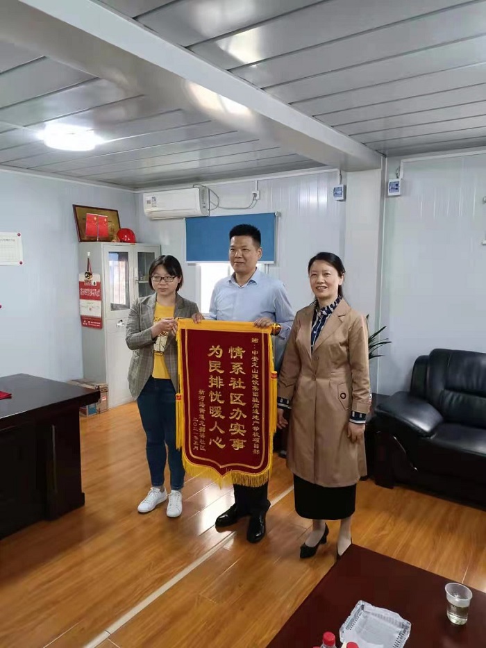 菱湖公館附屬學(xué)校項(xiàng)目部此次無(wú)償修繕行為得到了新西河村小區(qū)百姓的認(rèn)可。5月4日上午,新河路街道辦事處特委派新河路街道黨工委副書記、辦事處副主任程爽,龍獅橋社區(qū)黨委書記、主任孫玉萍來(lái)到項(xiàng)目部,為集團(tuán)公司送上了“情系社區(qū)辦實(shí)事,為民排憂暖人心”的錦旗。