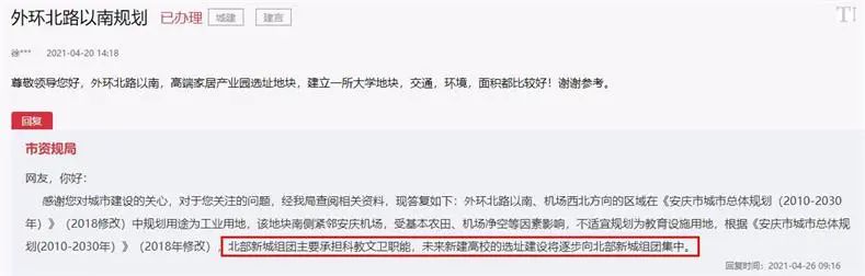 近期,有網(wǎng)友在領(lǐng)導(dǎo)留言板中建議外環(huán)北路以南規(guī)劃一所高校。有關(guān)部門的答復(fù)來了,我們一起來看~
