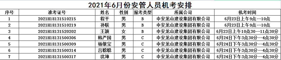 2021年6月份安慶市建筑施工企業(yè)安管人員機考場次安排