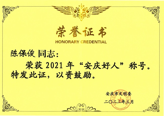 近日,安慶市文明委發(fā)放“安慶好人”證書,集團(tuán)公司員工陳??s登2021年度“安慶好人”榜。